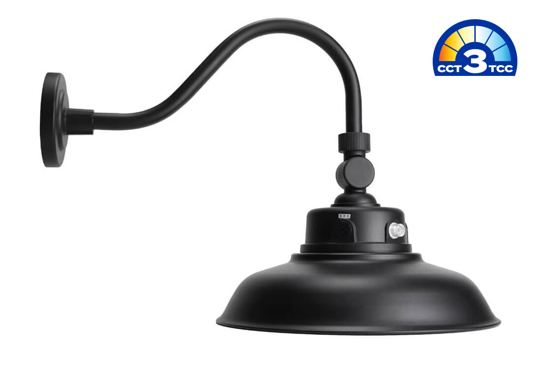 The Gooseneck offers general and security lighting for outdoor residential and/or commercial applications. It’s powerful lumen output, 3 selectable wattage options, 3CCT selectable color temperature, and dusk / dawn photocell option proves ideal for building facades, awnings, barn lighting, signage, and plenty more outdoor applications.